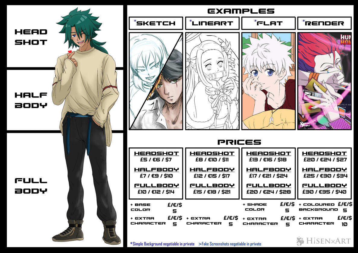 • I accept half up-front payment and half after lineart or finished commission only with Flat-Half/Full Body and Render-Half/Full body in extraordinary cases.